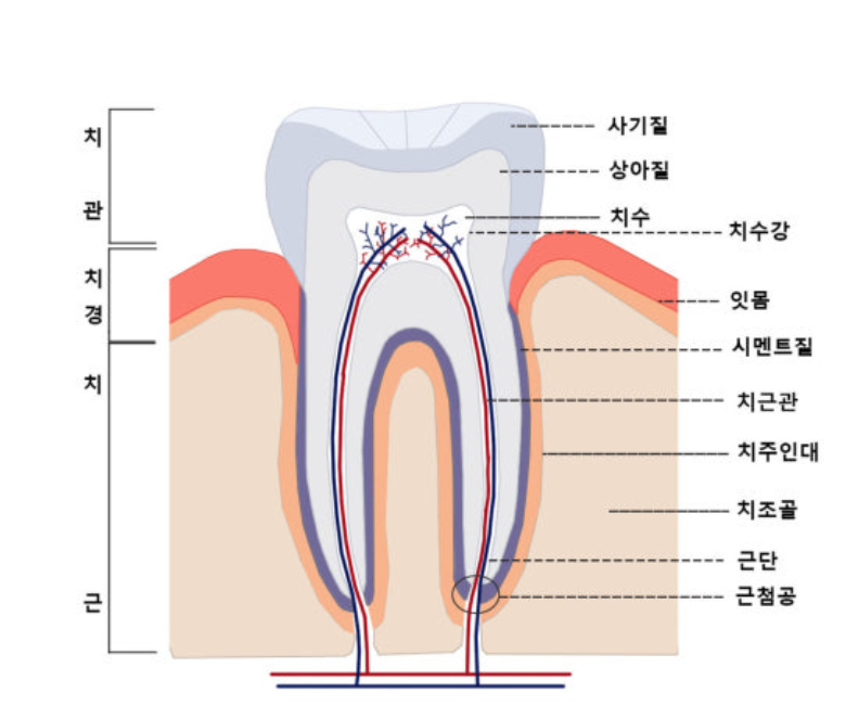 -치수강(dental cavity): 치아 중심에 위치. artery, vein, nerve 있음